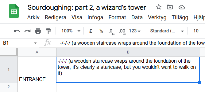 I remember writing that post, that generator, thinking one would run through it a-blazing, thirty floors in one minute, e.g. if I hadn't at least twenty entires, it wouldn't be enough. More more more. But as I use my own generator myself, I notice even the slightest - what should I call it - "insinuation" (i.e. as with the moss thing above, that made me think about why wouldn't the wizard clean that up etc etc), may or may not stall the process (for the poor reader/user) by some amount of time.